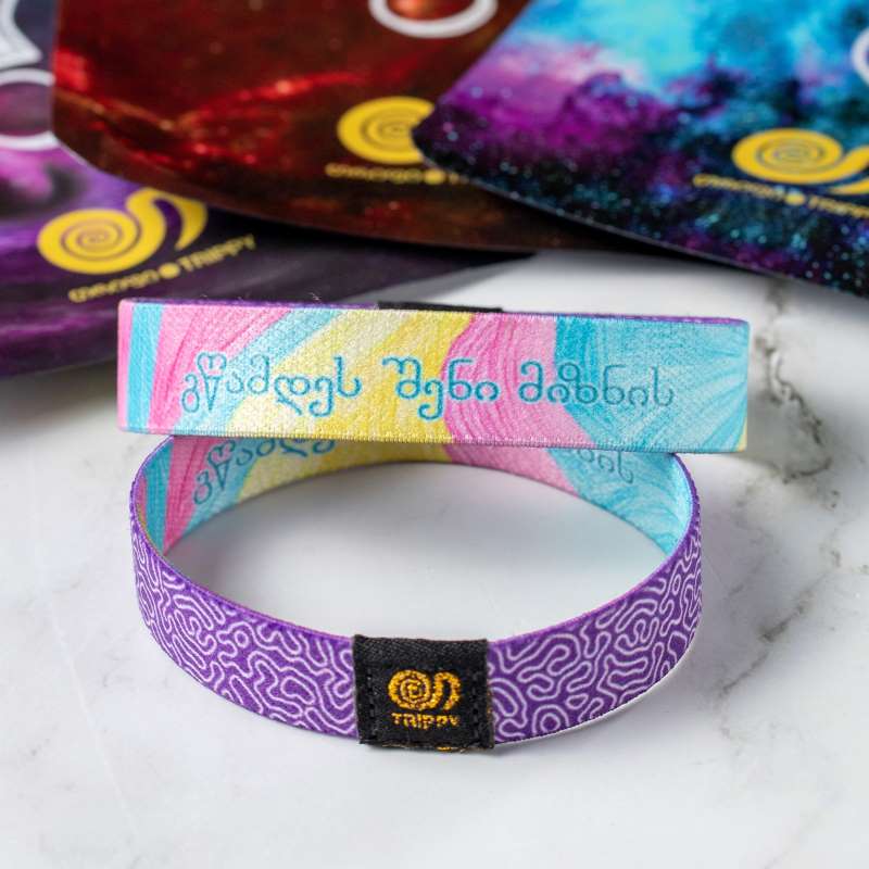 - ოქროსფერი ლოგოს სამაჯურები გაფორმებულია ქართული ინსპირაციული ფრაზებით.